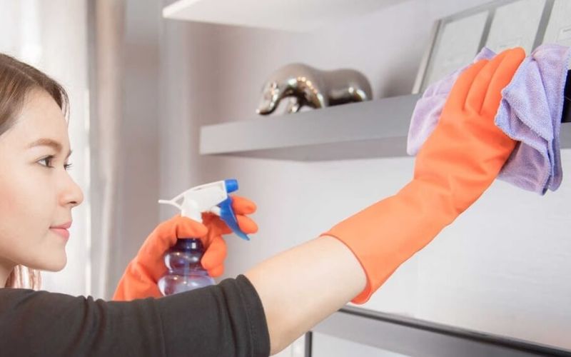 Vệ sinh và làm khô tủ bếp là bước quan trọng giúp loại bỏ tận gốc mùi ẩm mốc và ngăn vi khuẩn phát triển. Trước tiên, bạn nên lấy toàn bộ đồ dùng ra khỏi tủ, sau đó dùng khăn mềm lau sạch các bề mặt bằng dung dịch nước ấm pha giấm hoặc baking soda để khử khuẩn và mùi hôi. Đối với những vị trí có dấu hiệu nấm mốc, cần chà kỹ hơn để làm sạch hoàn toàn. Sau khi vệ sinh, dùng khăn khô lau lại nhiều lần để loại bỏ hơi ẩm còn sót lại, đồng thời mở cửa tủ trong vài giờ để không khí lưu thông.