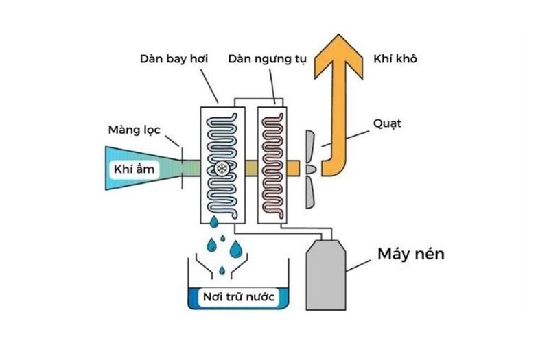 Máy hút ẩm ngưng tụ (máy nén lạnh) hoạt động dựa trên nguyên lý làm lạnh không khí ẩm để ngưng tụ hơi nước