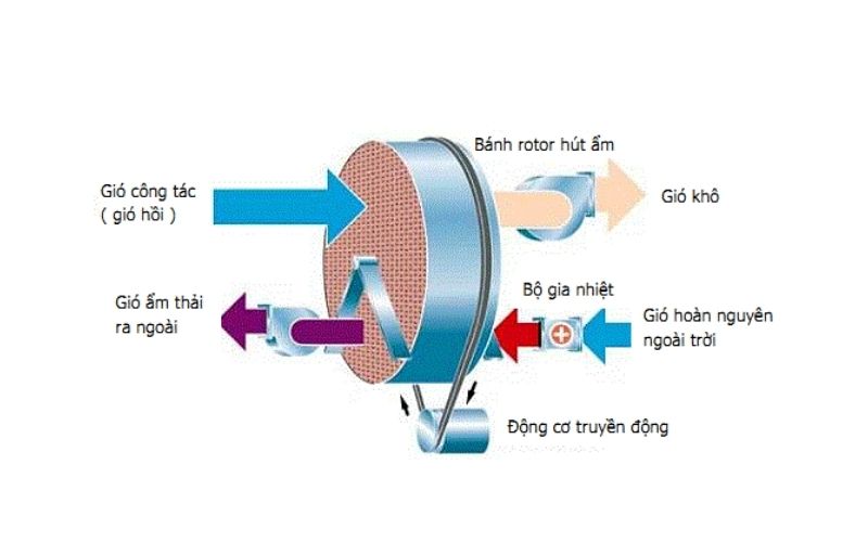 Máy hút ẩm hấp thụ hoạt động dựa trên nguyên lý sử dụng chất hút ẩm như rotor hoặc hạt hút ẩm