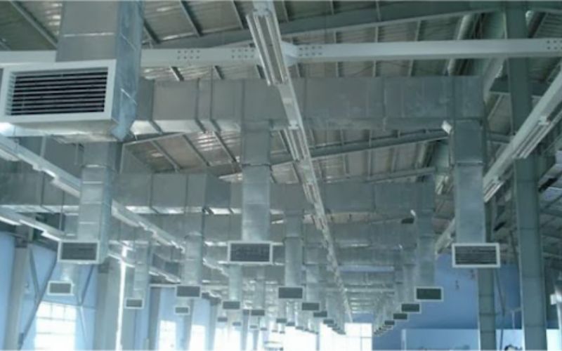 Hệ thống thông gió công nghiệp giúp hút không khí nóng ra ngoài và đưa không khí mát vào bên trong, giảm nhiệt tổng thể cho toàn bộ xưởng. Đây là giải pháp hiệu quả với nhà xưởng diện tích lớn hoặc cao tầng, nơi nhiệt dễ bị tích tụ. Hệ thống còn giúp cải thiện chất lượng không khí, giảm độ ẩm và loại bỏ bụi, mùi trong quá trình sản xuất. Việc thiết kế hệ thống thông gió hợp lý sẽ đảm bảo luồng khí lưu thông đều, không còn “vùng nóng” cục bộ.