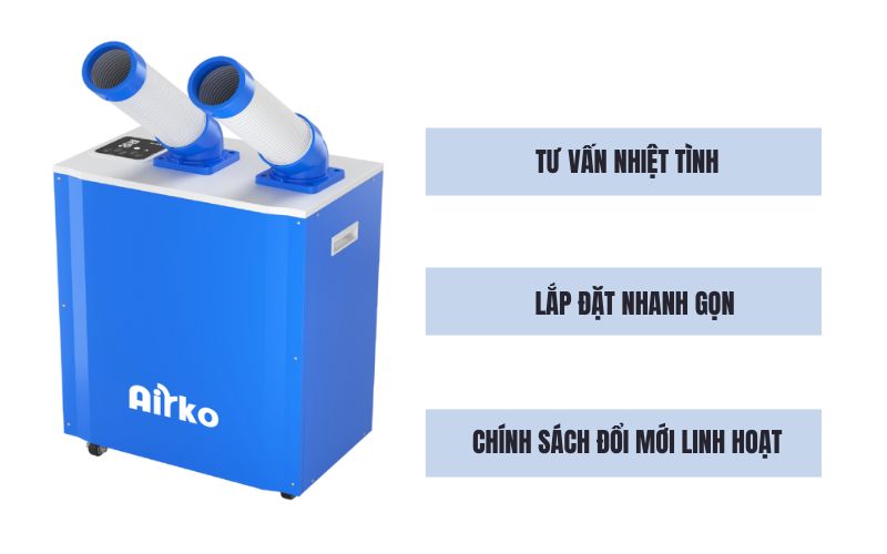 Ngoài ra, Airko chú trọng dịch vụ sau bán hàng – bảo hành tận nơi, hỗ trợ tư vấn kỹ thuật miễn phí, và cung cấp phụ kiện thay thế chính hãng.