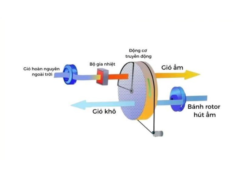 Ngoài cơ chế ngưng tụ, một số máy hút ẩm sử dụng nguyên lý hấp thụ bằng chất hút ẩm, thường là rotor chứa vật liệu hút ẩm chuyên dụng. Khi không khí ẩm đi qua rotor này, hơi nước sẽ bị giữ lại trong cấu trúc vật liệu. Sau đó, rotor được làm nóng để giải phóng hơi nước, ngưng tụ thành nước và thu lại vào khay chứa.
