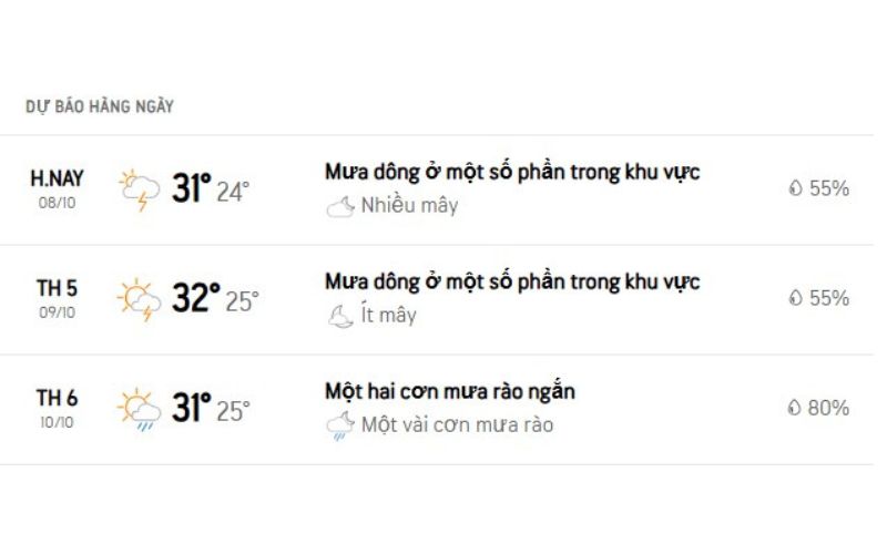 - Ngày 10/10/2025 (Ngày kia): Ban ngày trời nhiều mây, nắng nhẹ; chiều tối có thể xuất hiện mưa rào và dông cục bộ. Nhiệt độ 25–35°C, độ ẩm tăng vào buổi tối, gió nhẹ.